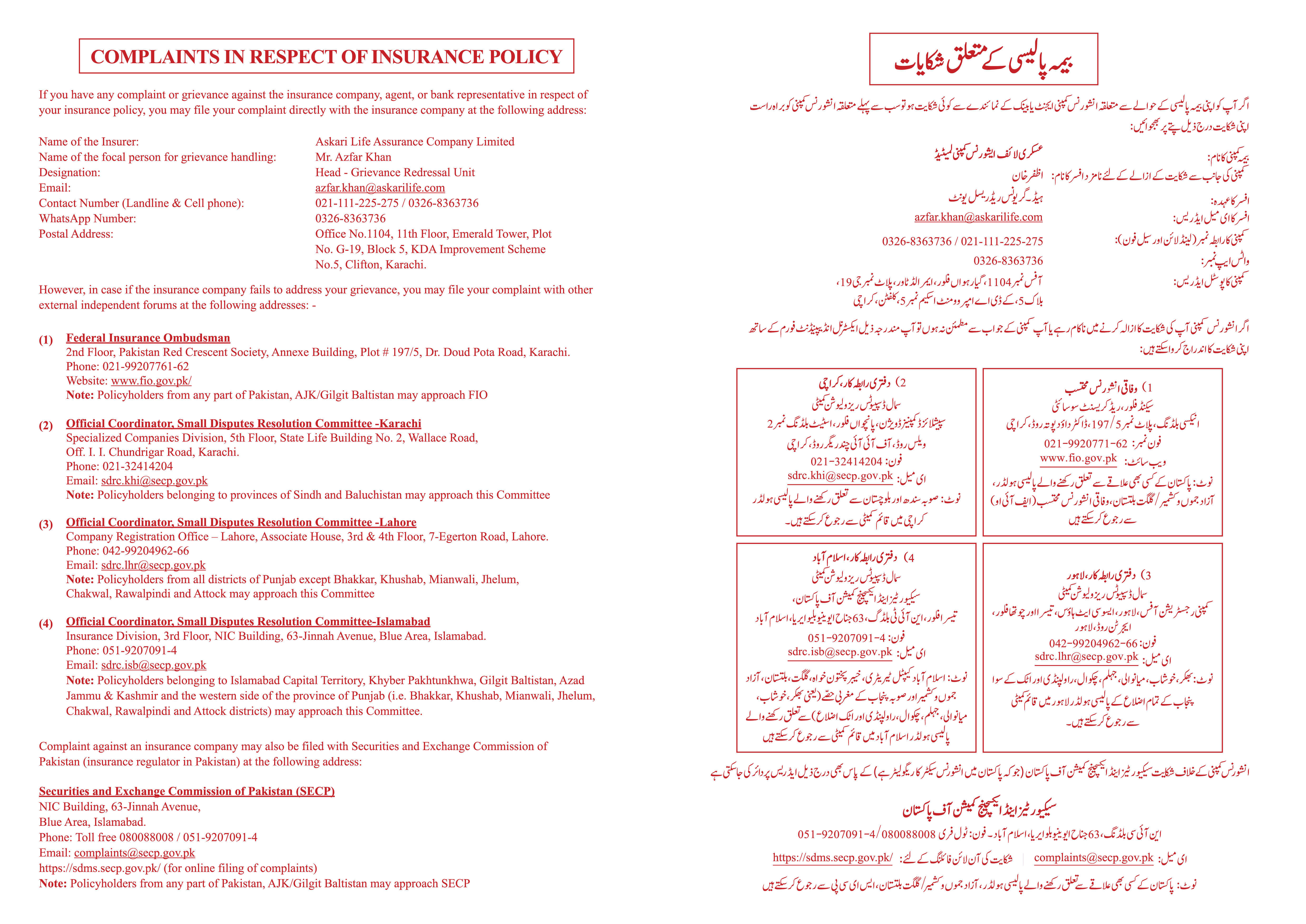 Insurance claim related issues can be sent to email address claims@askarilife.com